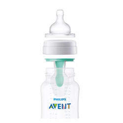 Nakładkę antykolkową AirFree™ opracowano, aby ograniczyć ilość powietrza połykanego przez dziecko. Smoczek pozostaje wypełniony mlekiem, nawet gdy jest ustawiony poziomo podczas karmienia w pozycji pionowej. Zredukowanie ilości powietrza połykanego przez dziecko pomaga złagodzić powszechne problemy związane z karmieniem, takie jak kolka, gazy i refluks