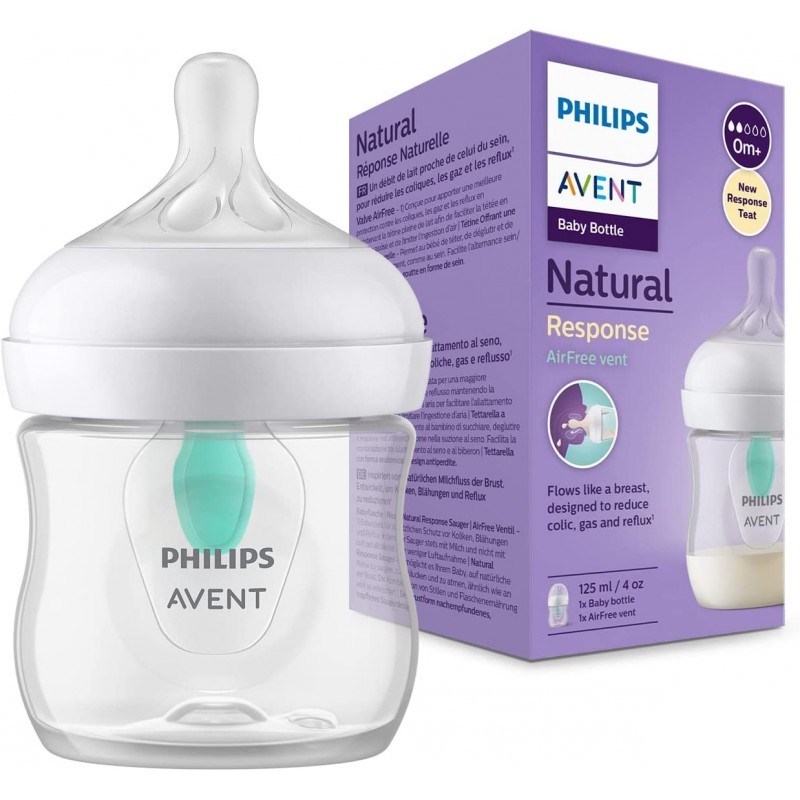 Butelka plastikowa 125ml z nakładką antykolkową AVENT Natural Response i smoczkiem, który działa jak pierś Mamy. Buteleczka jest poręcza, umożliwia chwytanie przez małe rączki, jak również łatwa w utrzymaniu w czystości. Smoczek szeroki, miękki, elastyczny, zaprojektowany tak, aby ułatwić łączenie karmienia piersią i butelką oraz wspierać naturalny rytm ssania małego dziecka. Wyposażony także w zaworki antykolkowe, które regulują w nich ilość powietrza. Wentylek AirFree umieszczony butelce ułatwia karmienie w pozycji pionowej, jak również jest dodatkową ochroną przeciwko kolce, gazom i refluksowi.