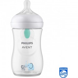 Butelka plastikowa SŁOŃ 260ml z nakładką antykolkową AVENT Natural Response i smoczkiem, który działa jak pierś Mamy. Buteleczka jest poręcza, umożliwia chwytanie przez małe rączki, jak również łatwa w utrzymaniu w czystości. Smoczek szeroki, miękki, elastyczny, zaprojektowany tak, aby ułatwić łączenie karmienia piersią i butelką oraz wspierać naturalny rytm ssania małego dziecka. Wyposażony także w zaworki antykolkowe, które regulują w nich ilość powietrza. Wentylek AirFree umieszczony butelce ułatwia karmienie w pozycji pionowej, jak również jest dodatkową ochroną przeciwko kolce, gazom i refluksowi.