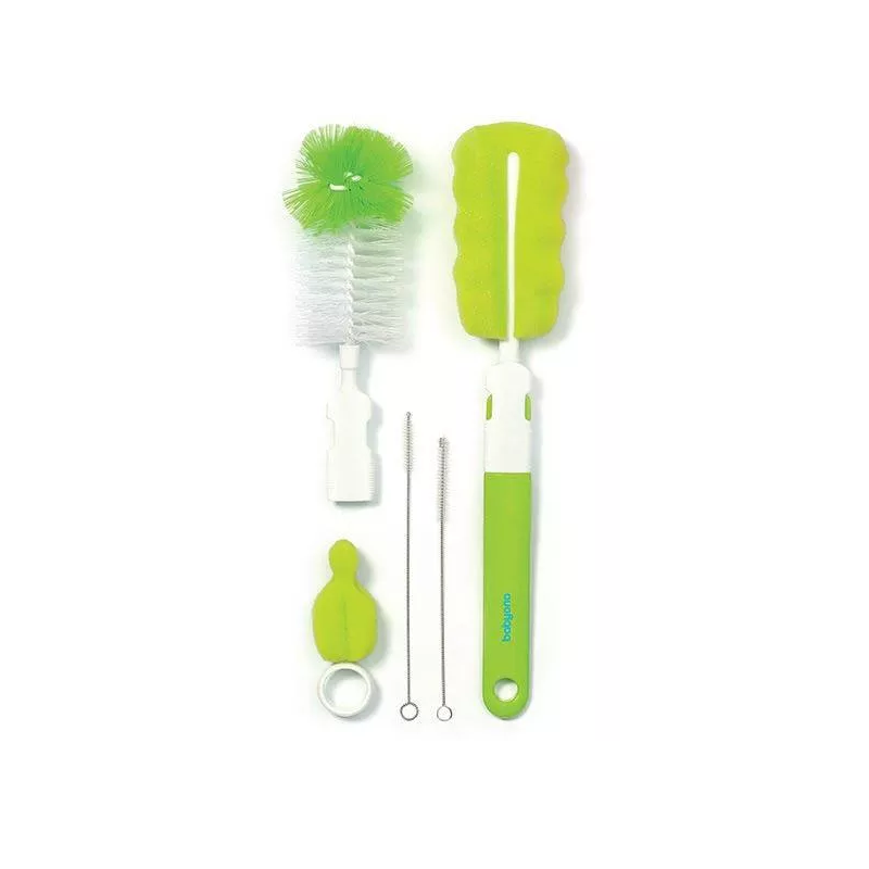 Zestaw szczotek do butelek i smoczków pomaga w ich dokładnym czyszczeniu. Zestaw jest wyposażony w dwie wymienne końcówki do mycia butelek, jedna jest zakończona szczotką z miękką włosiem druga elastyczną gąbką, końcówki można dowolnie zamieniać. Zestaw zawiera dodatkowo gąbkę do czyszczenia smoczków. Szczotka posiada otwór do zawieszenia w celu osuszenia przed kolejnym użyciem. Szczotki docierają do trudno dostępnych miejsc, a wygodne rączki zapewniają stabilny uchwyt. Szczotki wykonane są z trwałych i bezpiecznych materiałów, nie zawierających Bisfenolu A.