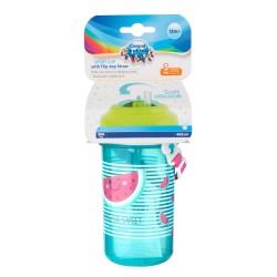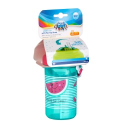 Praktyczny bidon z kolorowymi nadrukami wyposażony w wygodny pasek do noszenia np. podczas spacerów. Posiada składaną, silikonową słomkę, która chowa się po przekręceniu nakrętki. To rozwiązanie pozwala na utrzymanie czystości i zapobiega niechcianemu rozlewaniu płynu. Bidon idealny dla dzieci, które potrafią już samodzielnie pić. Wykonany z bezpiecznego tworzywa bez BPA. Pojemność 400ml. Przeznaczony dla dzieci powyżej 12. miesięcy.
