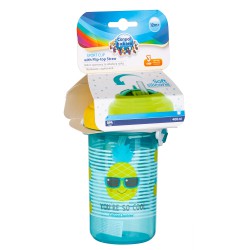 Praktyczny bidon z kolorowymi nadrukami wyposażony w wygodny pasek do noszenia np. podczas spacerów. Posiada składaną, silikonową słomkę, która chowa się po przekręceniu nakrętki. To rozwiązanie pozwala na utrzymanie czystości i zapobiega niechcianemu rozlewaniu płynu. Bidon idealny dla dzieci, które potrafią już samodzielnie pić. Wykonany z bezpiecznego tworzywa bez BPA. Pojemność 400ml. Przeznaczony dla dzieci powyżej 12. miesięcy.