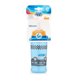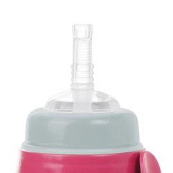 Kolorowy bidon z miękkim, silikonowym ustnikiem, który nie podrażnia delikatnych dziąseł i ząbków dziecka. Posiada praktyczną przykrywkę chroniącą ustnik przed zabrudzeniem, dzięki czemu sprawdzi się na spacerach i w podróży. Silikonowy ustnik jest połączony z plastikową rurką, która kończy się przy dnie bidonu i ułatwia picie napoju. Ustnik niekapek ma wbudowaną membranę, która zapobiega rozlewaniu napoju i umożliwia kontrolę intensywności wypływania płynu w zależności od siły ssania. Wyposażony w wygodny uchwyt umożliwiający przymocowanie bidonu do torby lub paska. Możliwość dokupienia wymiennego ustnika z rurką. Bidon wykonany z bezpiecznego tworzywa bez BPA. Pojemność 350ml. Przeznaczony dla dzieci powyżej 12. miesiąca życia.