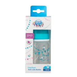 Antykolkowa butelka EasyStart LET'S CELEBRATE jest lekka, trwała i przejrzysta. Została wykonana z bezpiecznego polipropylenu wolnego od BPA. Posiada silikonowy smoczek 0m+ przypominający kształtem pierś mamy. Dzięki temu umożliwia łatwe łączenie karmienia piersią i butelką. Jest wyposażona w skuteczny system antykolkowy. Butelka o pojemności 120ml.