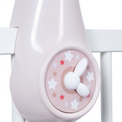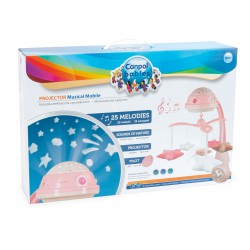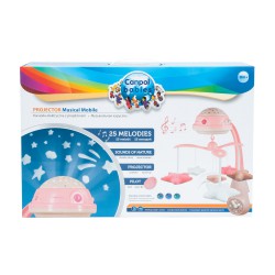 Elektryczna karuzela posiada projektor, pozytywkę oraz pluszowe zabawki, które zaciekawią maluszka. Zabawka dzięki posiadanym funkcjom pozytywnie wpływa na rozwój koordynacji wzrokowo-słuchowej dziecka. Projektor wyświetla gwiazdki i księżyce w różnych kolorach. Miłe dźwięki pozytywki oraz dźwięki natury wyciszą dziecko i ułatwią mu zasypianie. Karuzela posiada możliwość wyboru, aż 25 melodii.