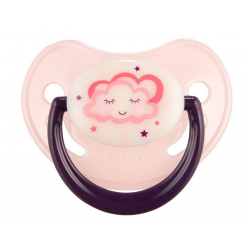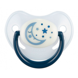 Smoczek uspokajający NIGHT DREAMS wykonany z najwyższej jakości, bezzapachowego silikonu. Wyposażony w gumę o anatomicznym kształcie. Zapewnia swobodne oddychanie i połykanie śliny. Specjalne otwory wentylacyjne na tarczce gwarantują swobodny przepływ powietrza i zapobiegają podrażnieniom delikatnej skóry dziecka. Świecąca tarczka ułatwia znalezienie smoczka w ciemności, a wygodny uchwyt ułatwia podawanie dziecku smoczka oraz pozwala na przymocowanie łańcuszka.