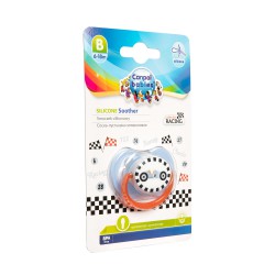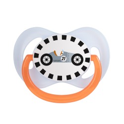 Smoczek uspokajający RACING wykonany z najwyższej jakości, bezzapachowego i bezsmakowego silikonu. Wyposażony w gumkę o symetrycznym kształcie. Zapewnia swobodne oddychanie i połykanie śliny. Smoczek dobrze odpowietrza się, dzięki specjalnym otworom wentylacyjnym na tarczce. Specjalnie zaprojektowany kształt tarczki, minimalizuje odciskanie się smoczka na delikatnej buzi dziecka. Nie zawiera BPA. Dostępny w kilku kolorach. Przeznaczony dla dzieci w wieku 6- 18 miesięcy.