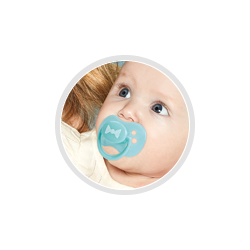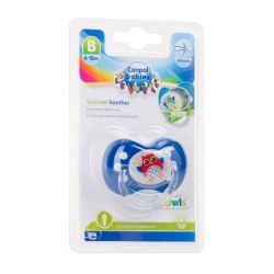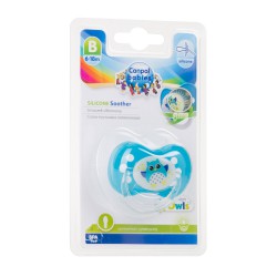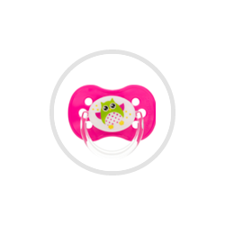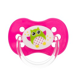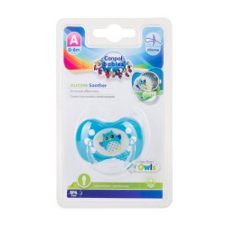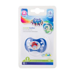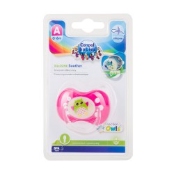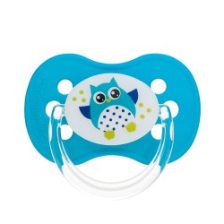 Smoczek uspokajający SÓWKI wykonany z najwyższej jakości, bezzapachowego silikonu. Wyposażony został w gumkę o symetrycznym kształcie. Smoczek dobrze odpowietrza się, dzięki specjalnym otworom wentylacyjnym na tarczce. Posiada świecącą tarczkę, która ułatwia znalezienie smoczka w ciemności. Nie zawiera BPA. Dostępny w kilku kolorach. Przeznaczony dla dzieci w wieku 0-6 miesięcy.