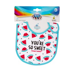 Śliniaczki z kolekcji "SO COOL" ze wzorem arbuza lub ananasaochronią ubranie dziecka przed zabrudzeniem podczas posiłku. Wykonane z miękkiej bawełny nie podrażniają delikatnej skóry dziecka, a folia znajdująca się od spodu zabezpiecza ubranie. Wygodne zapięcie na rzep.