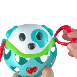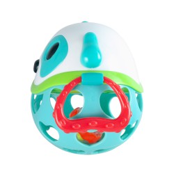 Zabawka posiada różne faktury i kontrastowe kolory które stymulują zmysły dziecka. Elastyczne i ażurowe elementy ułatwiają chwytanie i rzucanie zabawką. Grzechotka z kolorowymi koralikami widoczna przez ażurowe elementy na pewno wzbudzi ciekawość i zachęci maluszka do zabawy, a elastyczne uchwyty z wypustkami ukoją swędzące dziąsła.