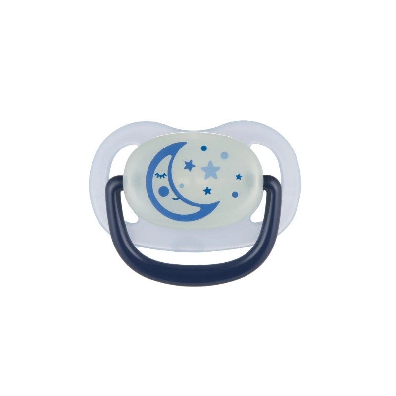 Smoczek uspokajający NIGHT DREAMS wykonany z najwyższej jakości, bezzapachowego i bezsmakowego silikonu. Wyposażony został w gumkę o anatomicznym kształcie. Smoczek dobrze odpowietrza się, dzięki specjalnym otworom wentylacyjnym na tarczce. Posiada świecącą tarczkę, która ułatwia znalezienie smoczka w ciemności. Nie zawiera BPA.